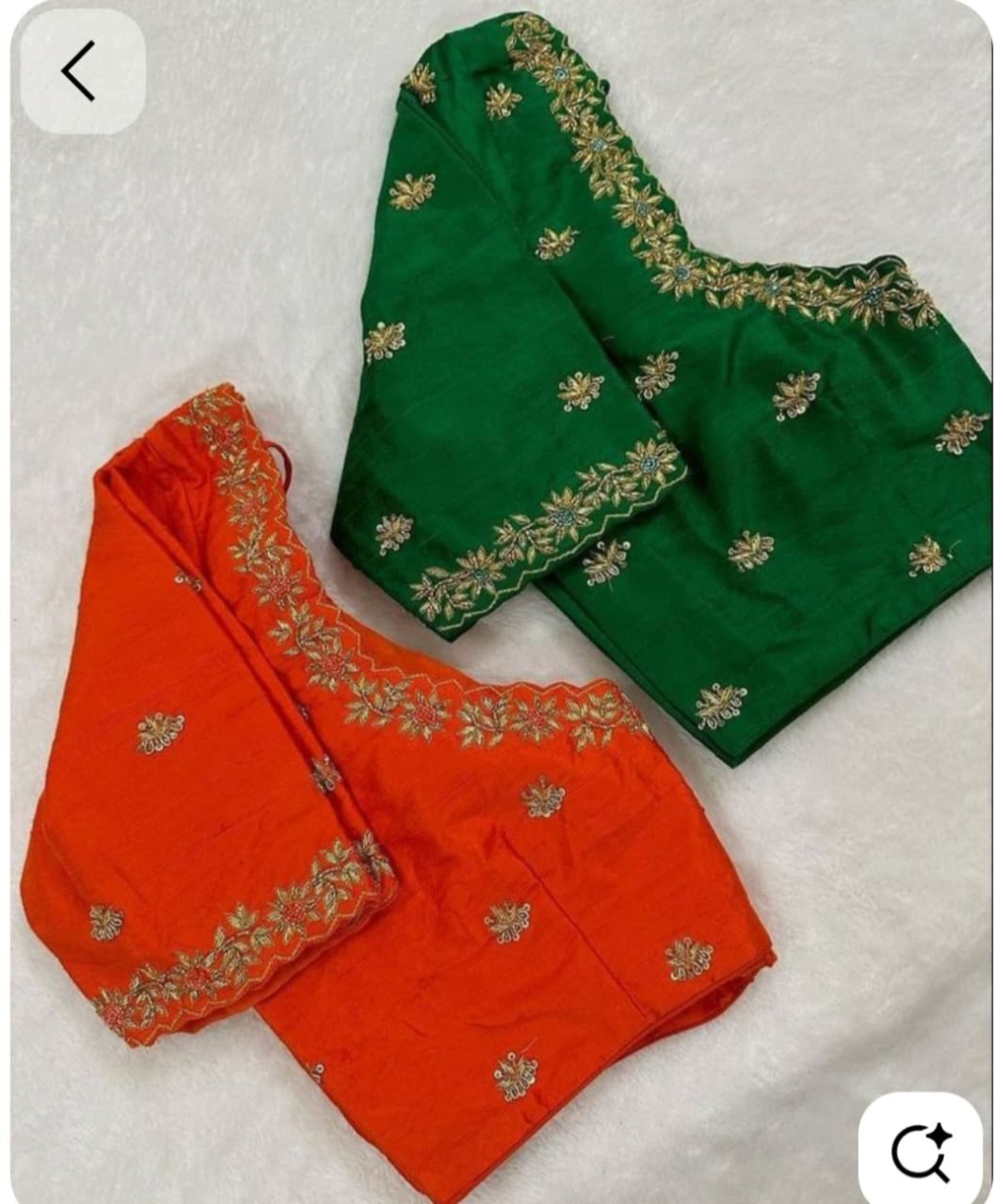 Available in rich emerald green and vibrant orange, this blouse is designed to complement silk, cotton silk, Banarasi, and festive sarees. The classic sleeve length and refined embroidery make it a versatile choice for festive occasions, weddings, poojas, and traditional celebrations.