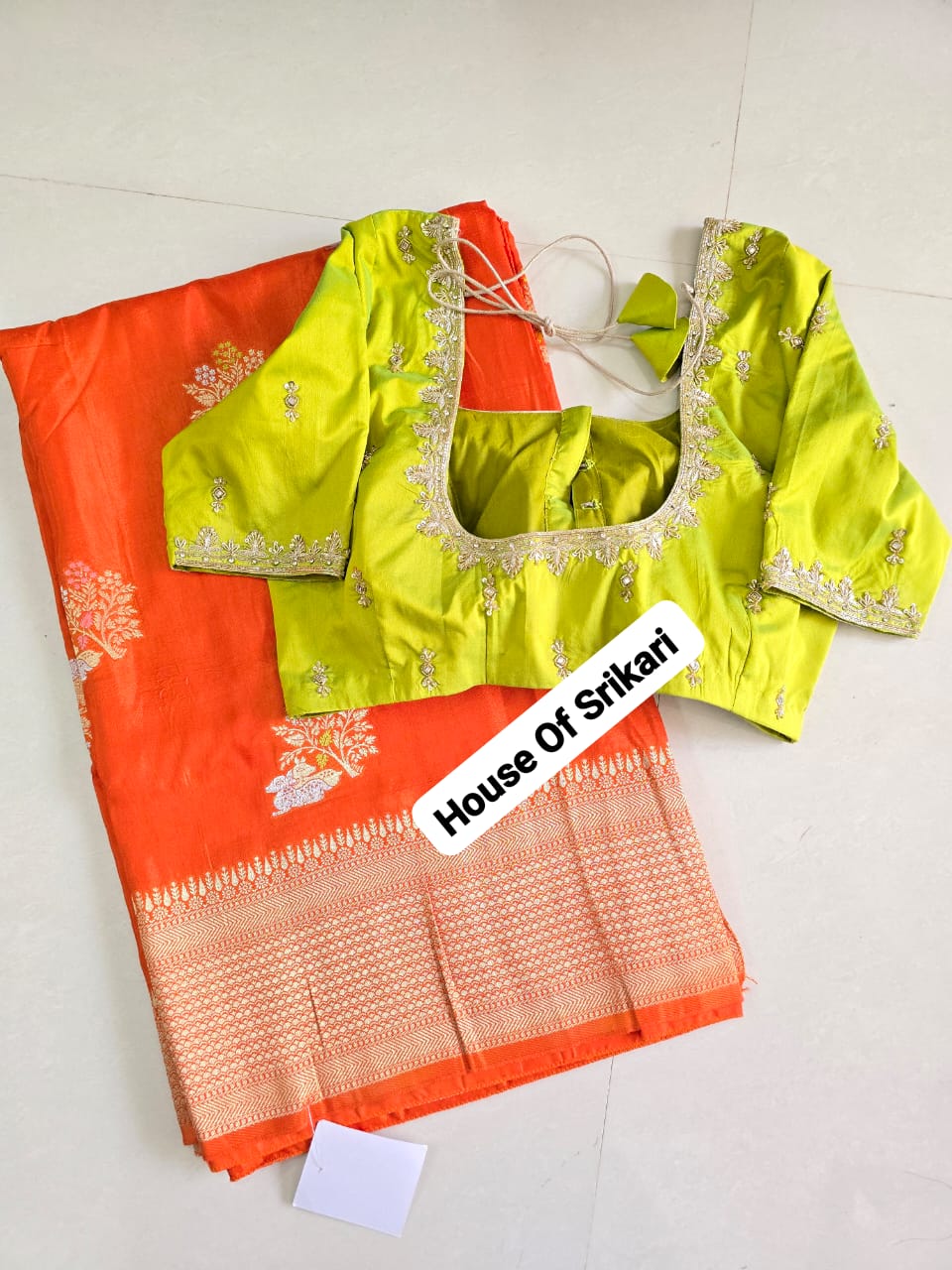Beautiful Customized Silk Saree featuring a vibrant orange body with subtle traditional motifs, paired with a handcrafted lime-green designer blouse embellished with delicate embroidery. A perfect blend of freshness and tradition, ideal for weddings and festive celebrations.