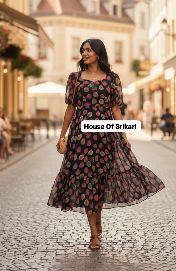 Designed with sheer puff sleeves, a flattering square neckline, and a flowy tiered hem, this dress offers effortless elegance and movement. Perfect for evening outings, casual chic wear, travel styling, and semi-formal gatherings.