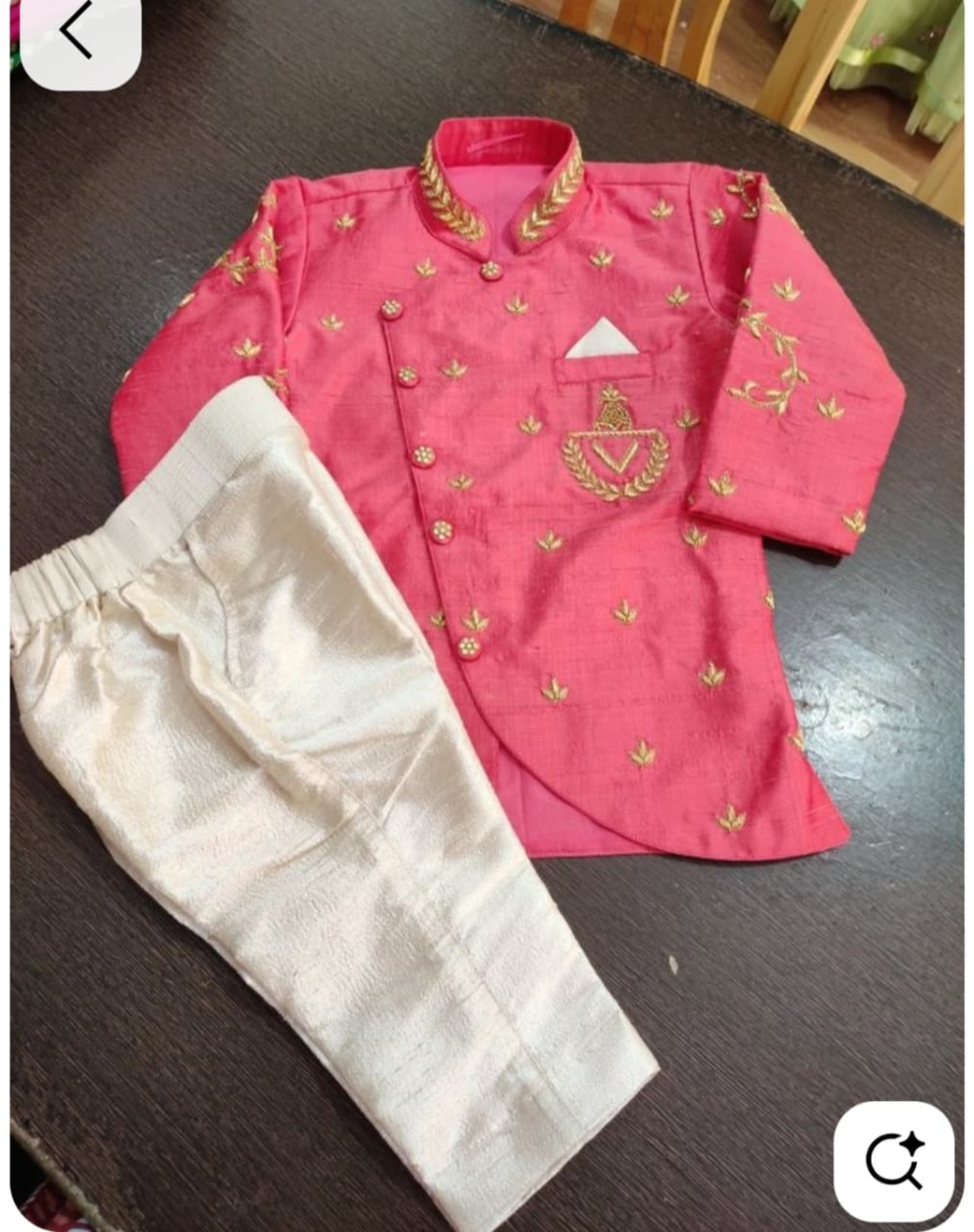 The elegant ivory pyjama complements the vibrant pink hue, ensuring comfort and style in equal measure. Designed for festive occasions and celebrations, this outfit reflects timeless tradition with a modern, tailored finish.