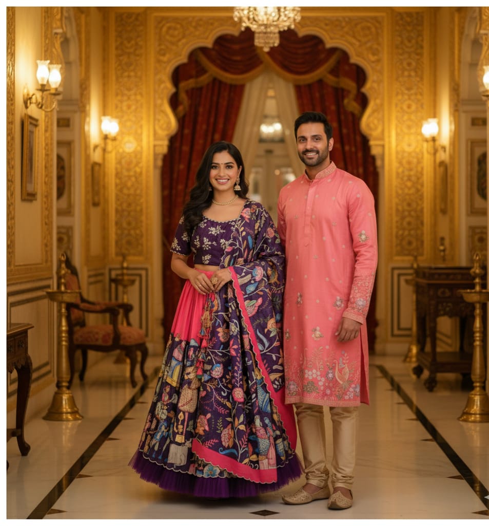 Make a grand statement with this luxurious Couple Festive Wear Set, designed for weddings and royal celebrations. The womenβs outfit features a rich purple printed lehenga adorned with intricate folk-inspired motifs, paired with a matching embroidered blouse and contrasting pink inner flare. The dupatta is beautifully detailed with artistic prints and decorative borders.