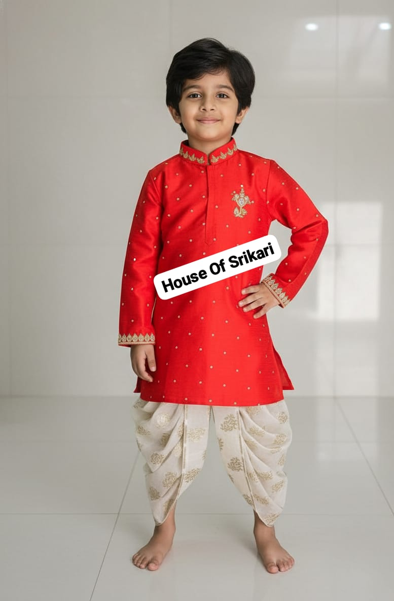Dress your little prince in timeless tradition with the Royal Crimson Kurta Dhoti Set from House of Srikari. Crafted in a rich red hue, the kurta features delicate gold butti detailing and elegant embroidery on the collar and cuffs, adding a regal festive charm.